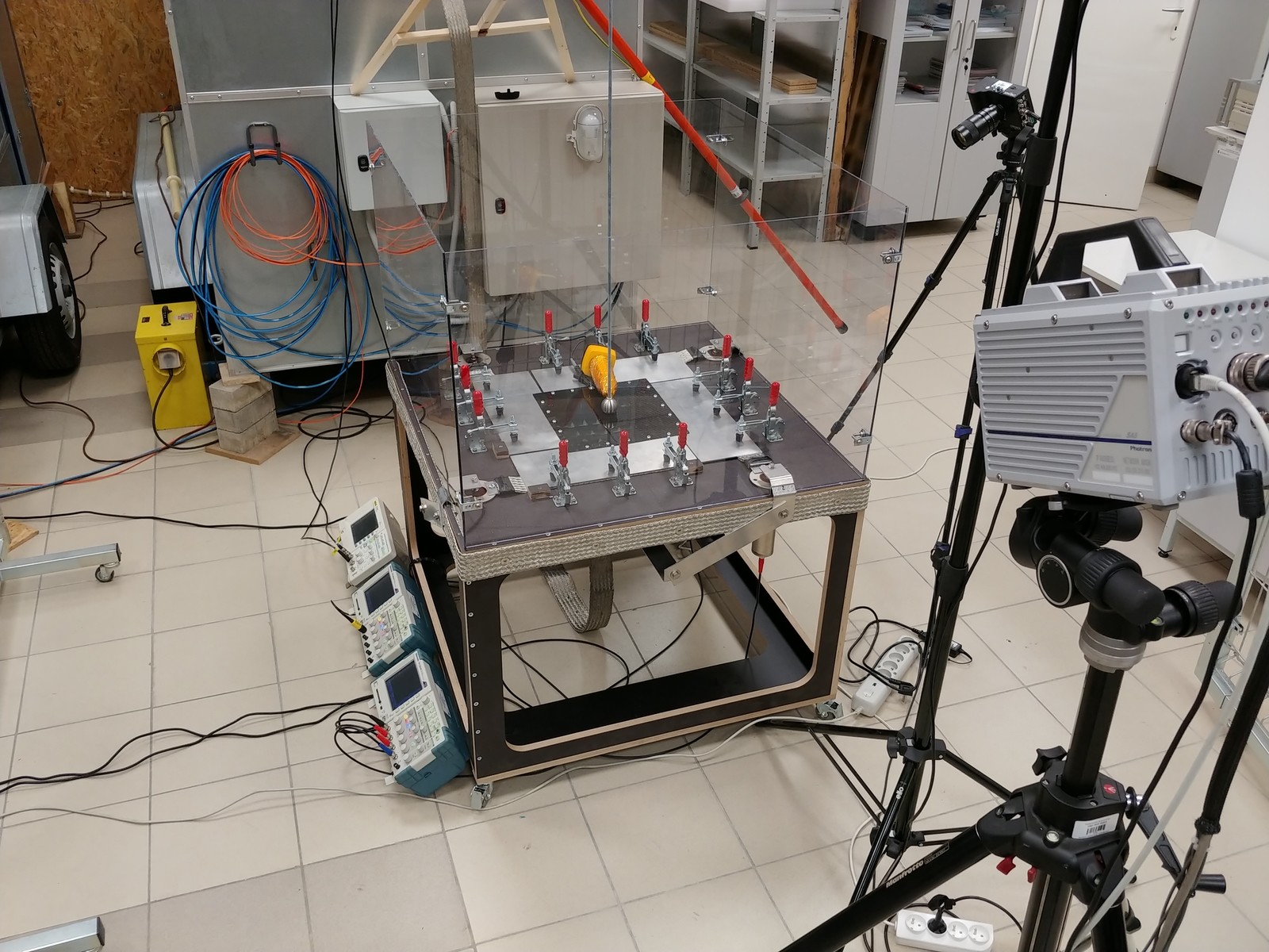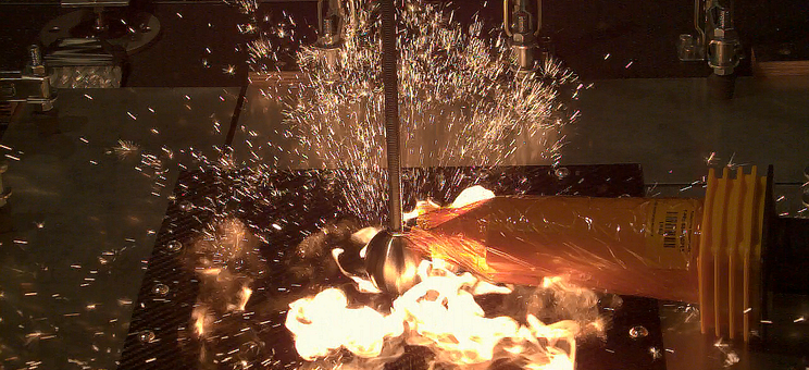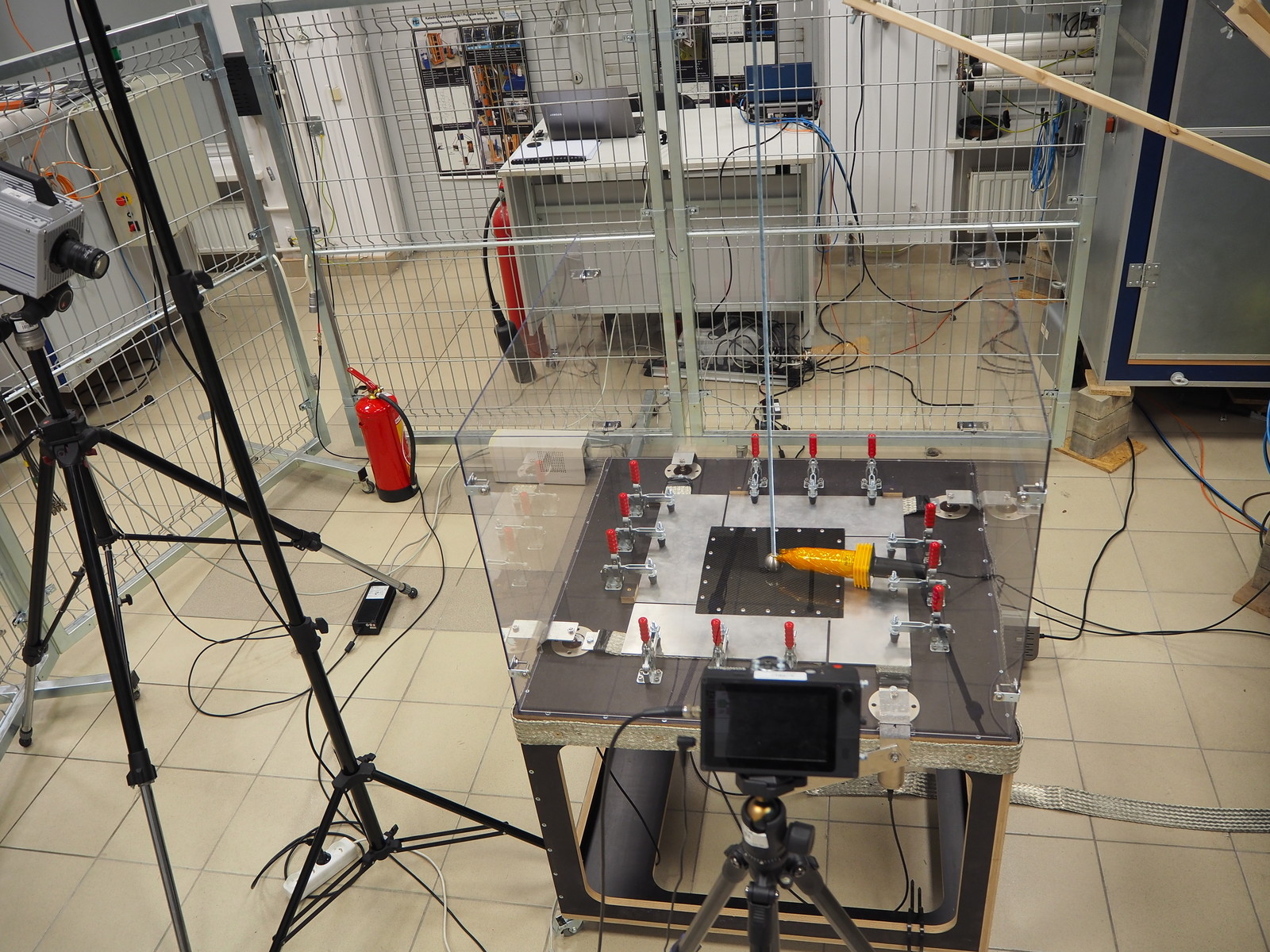 Najnowsze badania prowadzone w Laboratorium Oddziaływań Piorunowych skupiają się na testowaniu i rozwoju nowo opracowanych materiałów polimerowych z zatopionymi wewnątrz taśmami z włókien węglowych zwanych kompozytami. Badania realizowane są we współpracy z Katedrą Kompozytów Polimerowych Politechniki Rzeszowskiej. Kompozyty mają duże znaczenie między innymi dla przemysłu lotniczego z uwagi na swoją niewielką wagę oraz lepsze własności mechaniczne w porównaniu z cięższymi materiałami metalowymi. Są więc coraz częściej wykorzystywane do budowy statków powietrznych, w tym głównie samolotów oraz dronów. Uzyskuje się w ten sposób większą zdolność transportową, zmniejszenie zużycia paliwa, redukcję kosztów i emisji szkodliwych substancji do środowiska. Ograniczeniem są jednak gorsze, w porównaniu z metalami, własności elektryczne takich materiałów. Dobra przewodność prądu elektrycznego jest niezwykle istotna szczególnie w kontekście odporności na zjawiska towarzyszące wyładowaniom atmosferycznym. Dlatego też podejmowane są próby modyfikacji struktury materiałów kompozytowych, aby zapewnić im wymaganą przewodność elektryczną przy jednoczesnym zachowaniu pożądanych własności mechanicznych i niewielkiej wagi.