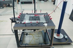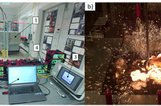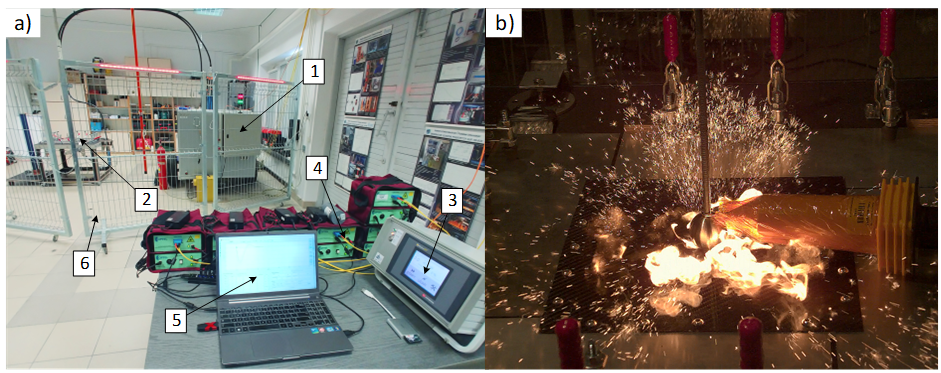 Badanie laminatów kompozytowych za pomocą impulsów prądowych typu piorunowego: a) widok stanowiska badawczego (1 - generator prądu impulsowego, 2 - stanowisko badawcze, 3 - jednostka sterująca, 4 - światłowodowy system pomiarowy, 5 - akwizycja danych, 6 - ogrodzenie pola testowego wysokiego napięcia; b) efekt działania impulsu prądowego na badany panel kompozytowy.
